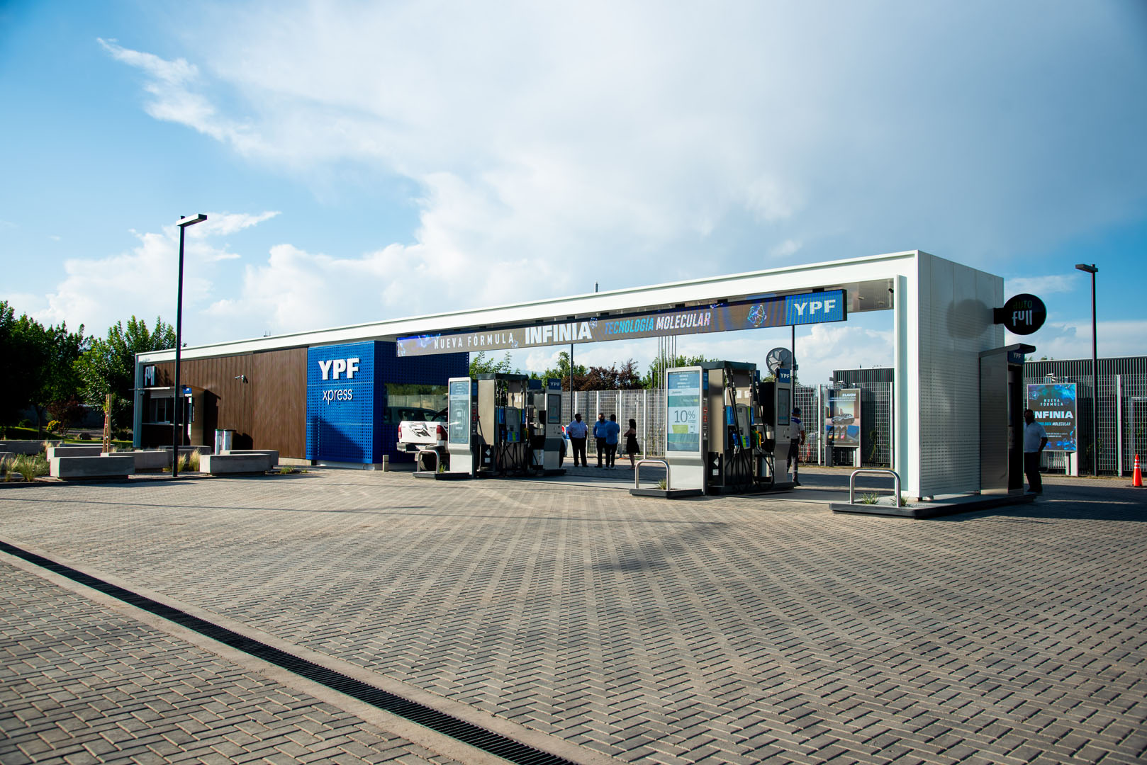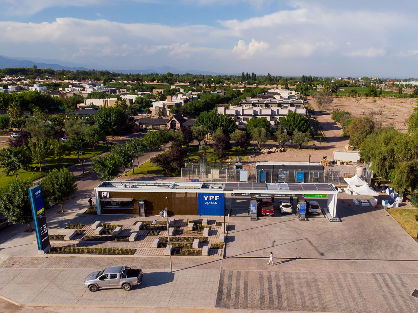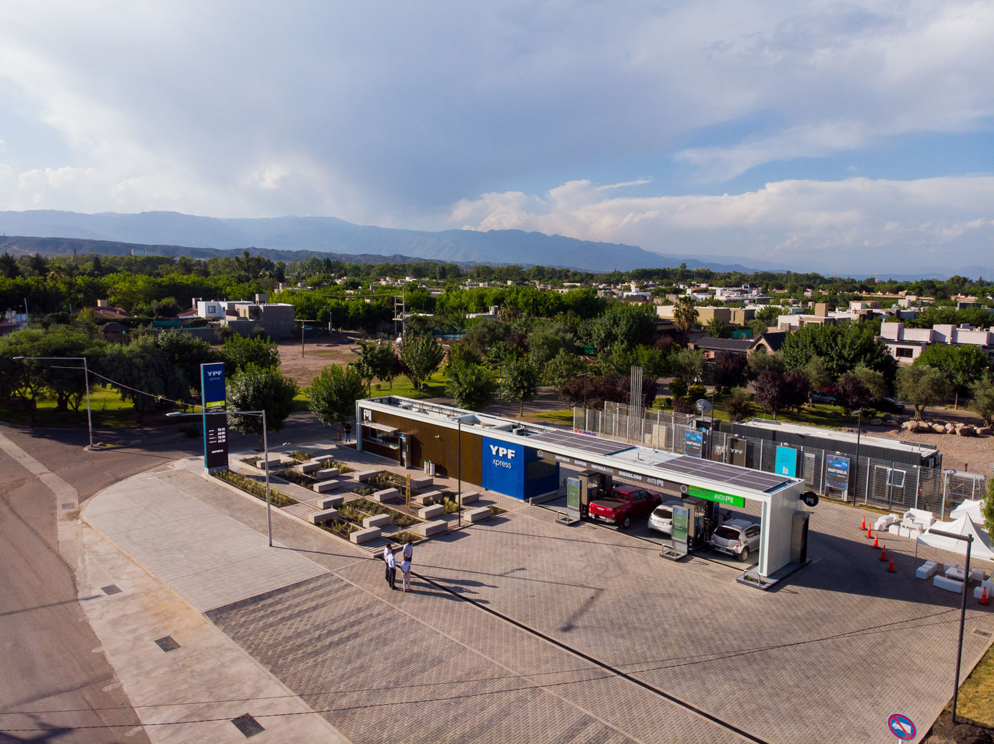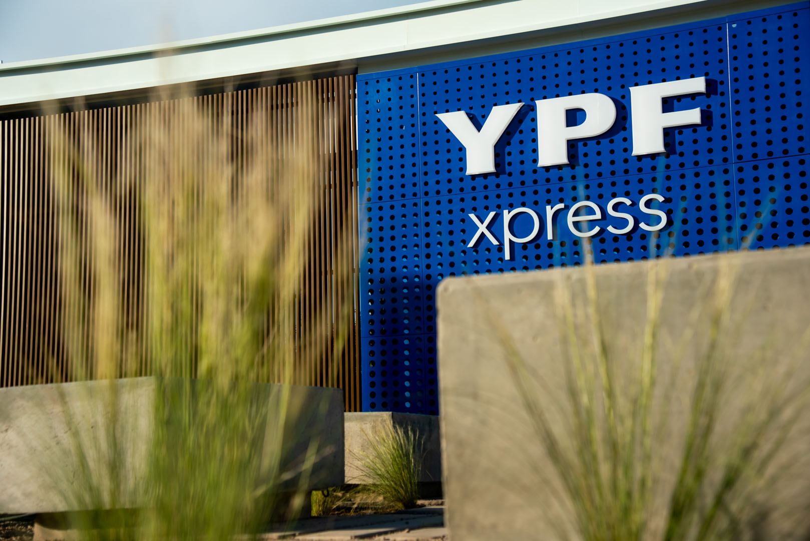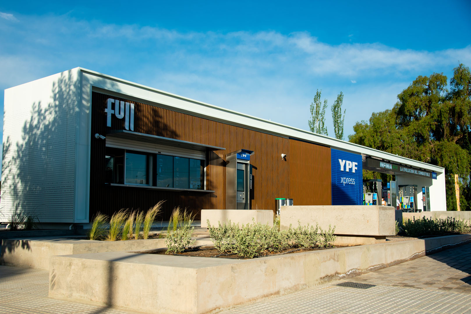 Estación eficiente energéticamente, con paneles solares, recupero de agua de lluvia y plantas de bajo mantenimiento.
